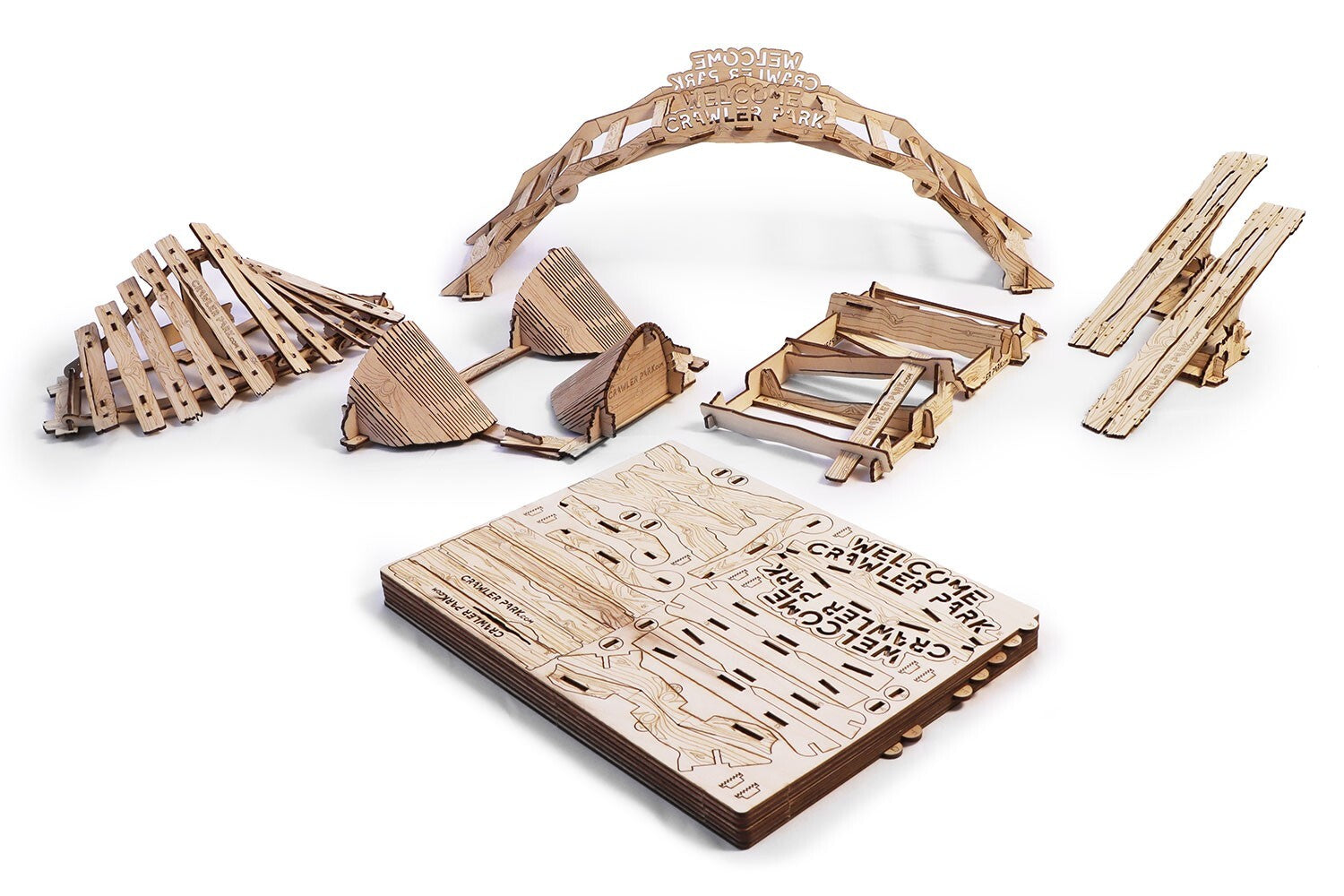 Crawler Park will surprise and challenge you from the beginning. You will enjoy assembling the obstacles by removing the pre-cut pieces from the board with light pressure. During the 3D assembly it is not necessary to use any glues. Consult the assembly instructions by scanning the QR code printed on the product box or visiting our website: www.crawlerpark.com